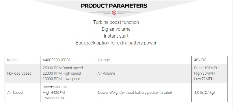 Højhastighedsrotationsventilator: Turbo-ventilatoren inde i bladblæseren er designet til at rotere i høj hastighed og generere stærk luftstrøm for at sikre rengøringseffekten.